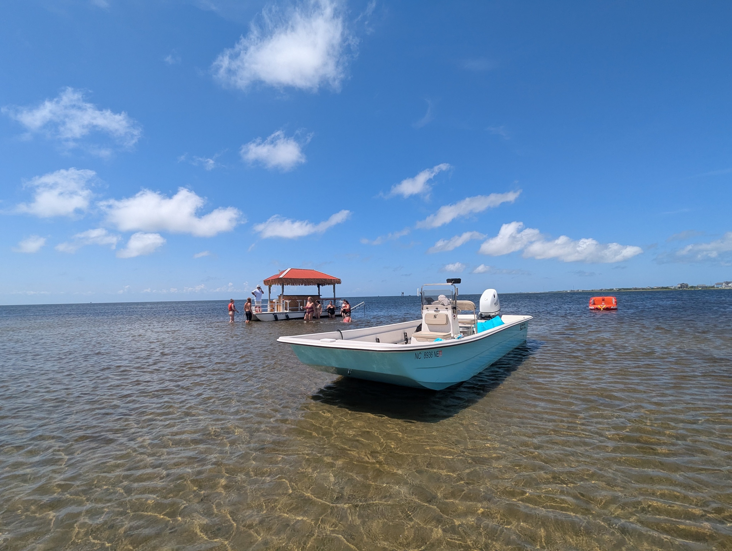 We make getting there effortless—our skiff shuttles your group in parties of up to six from the dock to the sandbar where the Tiki Boat is already anchor, ensuring everyone arrives safely and comfortably.